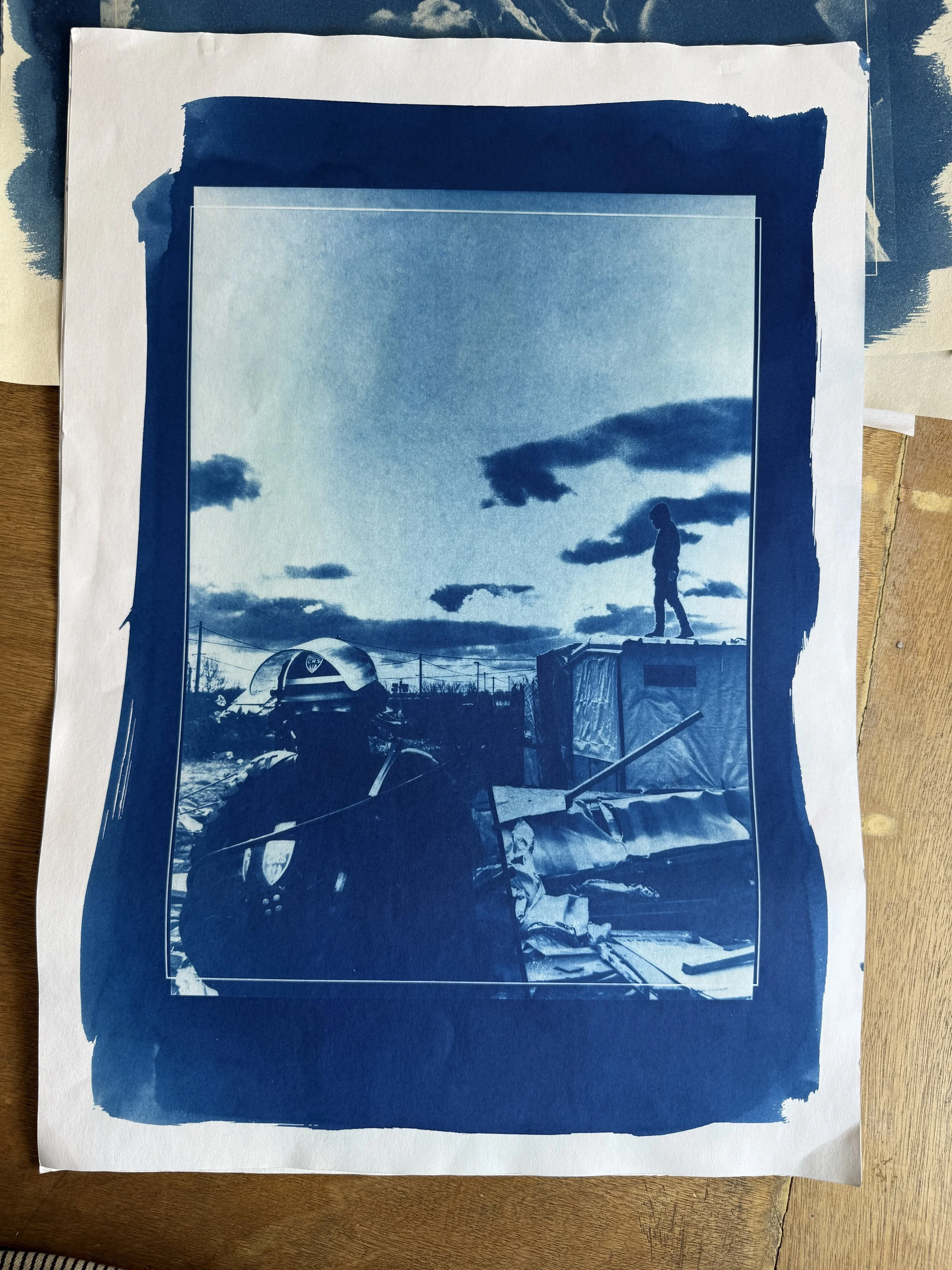“The long way round” is abstracted view of a refugee camp on the border of France and England. The images are printed in the cyanotype method to take the photos away from traditional photographic objectivity that I felt did not portray the truth of the camp, people and situation. Instead I have tried to create some deeper sense of loss and sadness and happiness and community that I felt I could not capture in straight photographs.